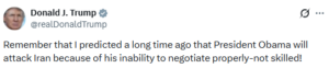 “Ricordate che avevo previsto molto tempo fa che il presidente Obama avrebbe attaccato l’Iran a causa della sua incapacità di negoziare correttamente—non abile!”, si può leggere ancora nel tweet che ancora in queste ore rimbalza sui social spinto dall’opposizione e critici del tycoon.